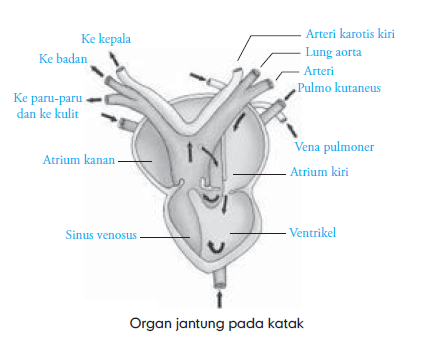 Pada katak juga sistem peredaran darah tertutup dan peredaran darah ganda. Di katakan ganda karena darah melalui jantung sebanyak dua kali dalam satu peredaran darah. Pertama, darah dari jantung menuju ke paru-paru kemudian kembali ke jantung dan kedua darah dari seluruh tubuh menuju ke jantung dan di edarkan kembali ke seluruh jantung. Jantung katak terdiri dari tiga ruangan, yaitu dua atrium dan sebuah ventrikel.