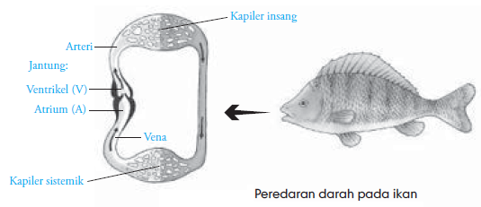 Pada saat jantung mengendur, darah mengalir melalui klep, masuk ke dalam ventrikel. Dari ventrikel di teruskan ke konus arteriosus kemudian menuju aorta ventralis dan di lanjutkan ke insang. Di insang, aorta bercabang-cabang menjadi kapiler (pembuluh-pembuluh kecil). Kapiler-kapiler insang melepaskan karbon dioksida dan mengambil oksigen dari air. Dari cabang-cabang aorta dorsalis ini darah di distribusikan ke kapiler-kapiler di seluruh bagian tubuh untuk mengedarkan oksigen dan zat makanan ke sel-sel tubuh.